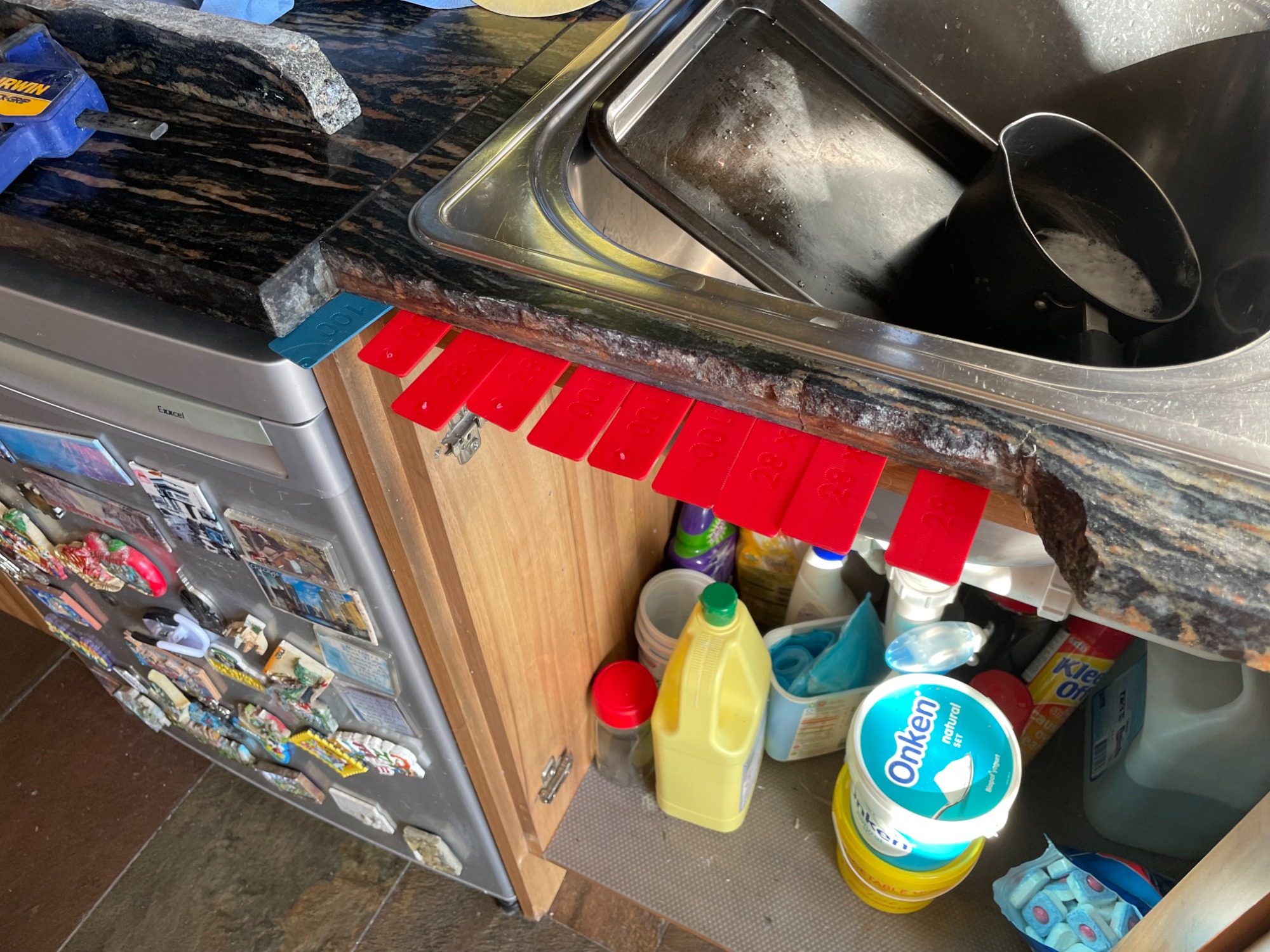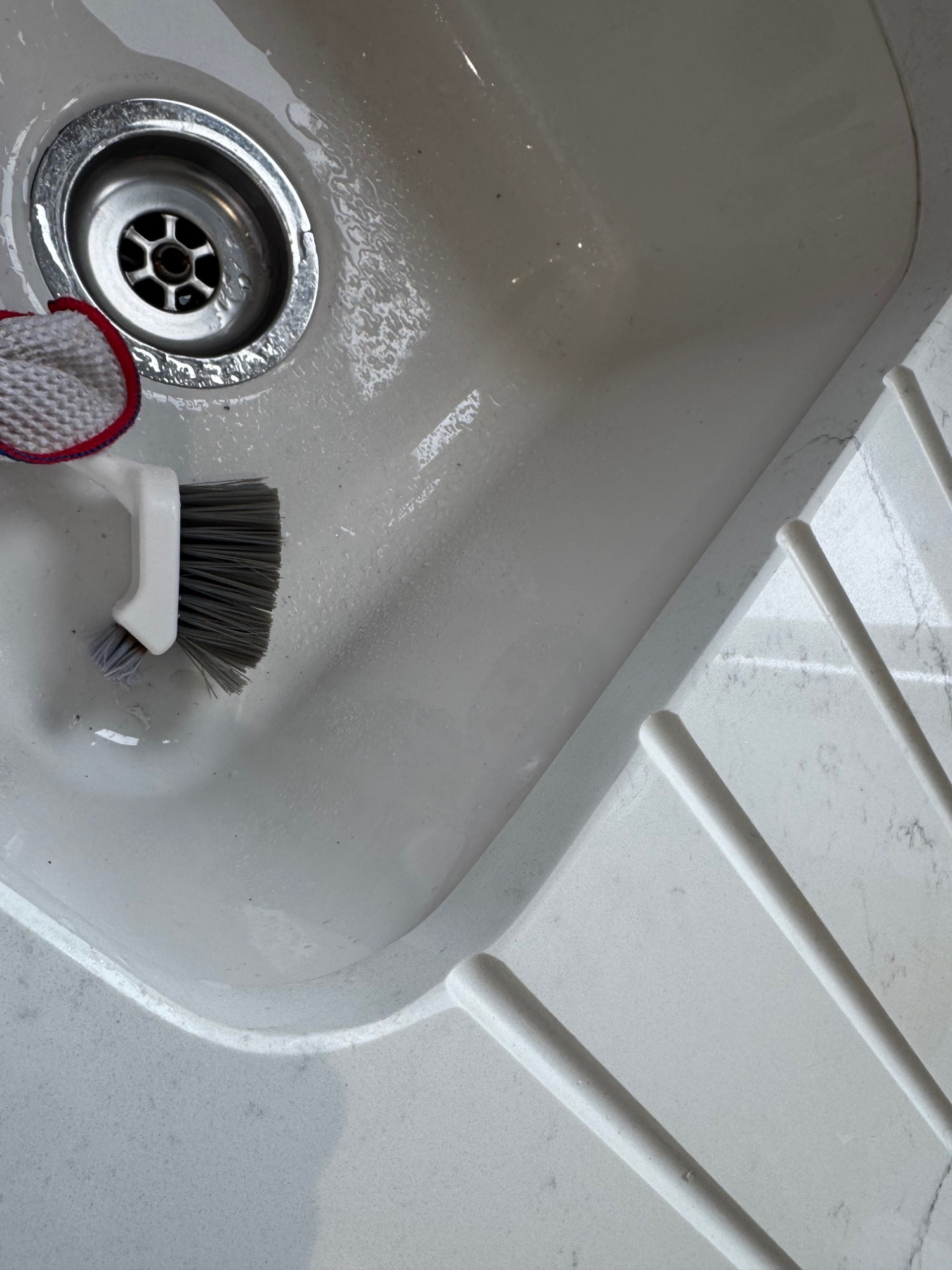 Chipped quartz worktop at sink area.