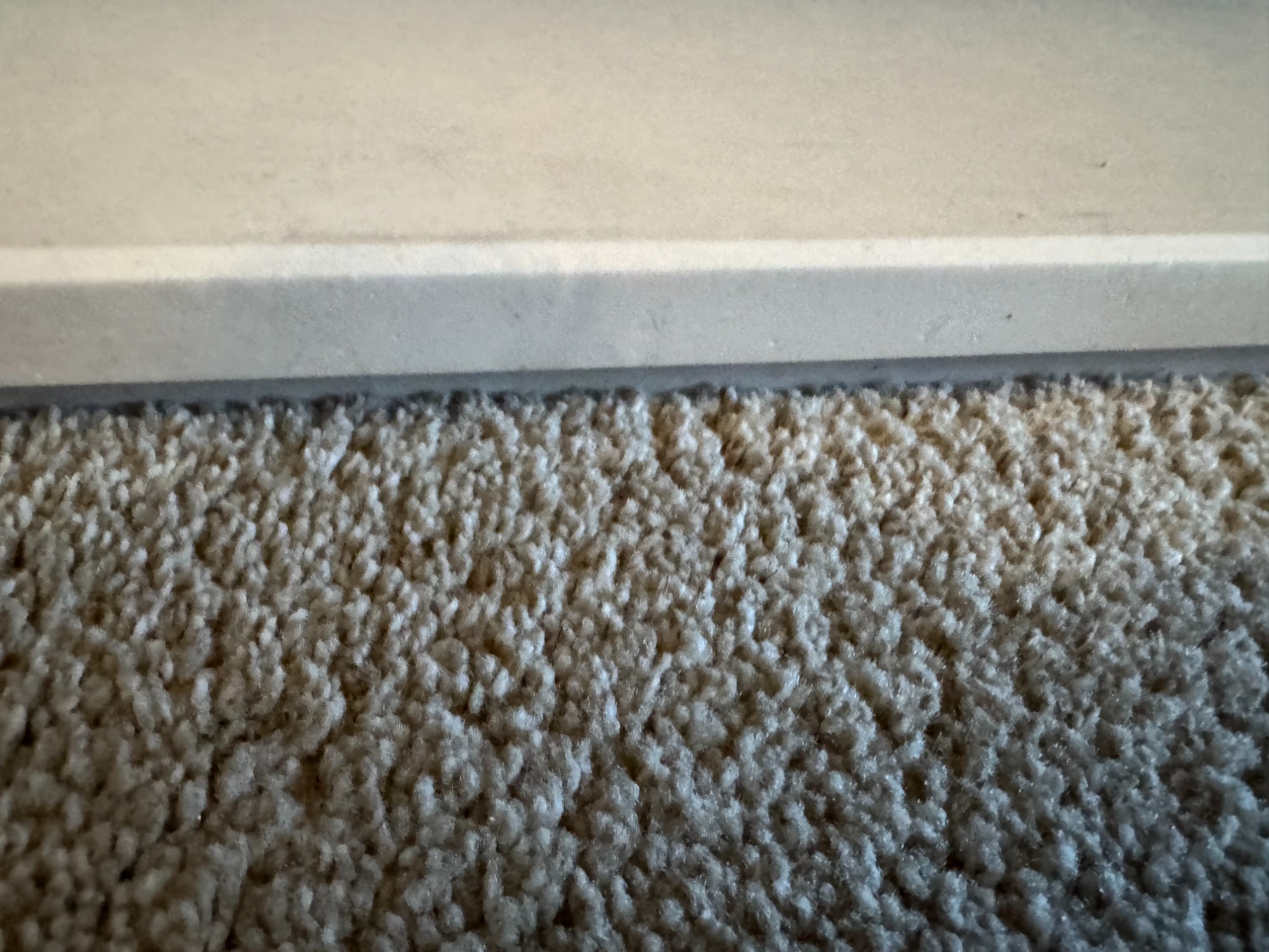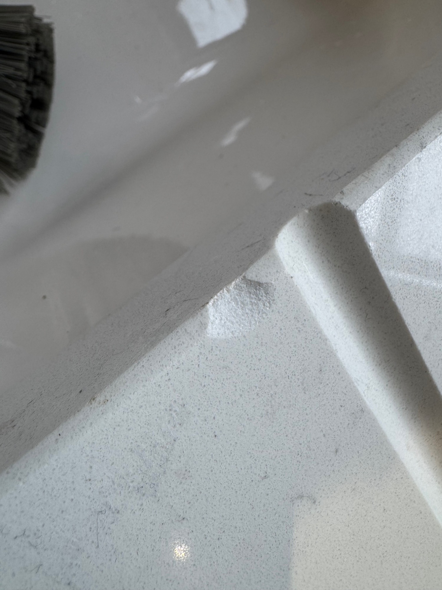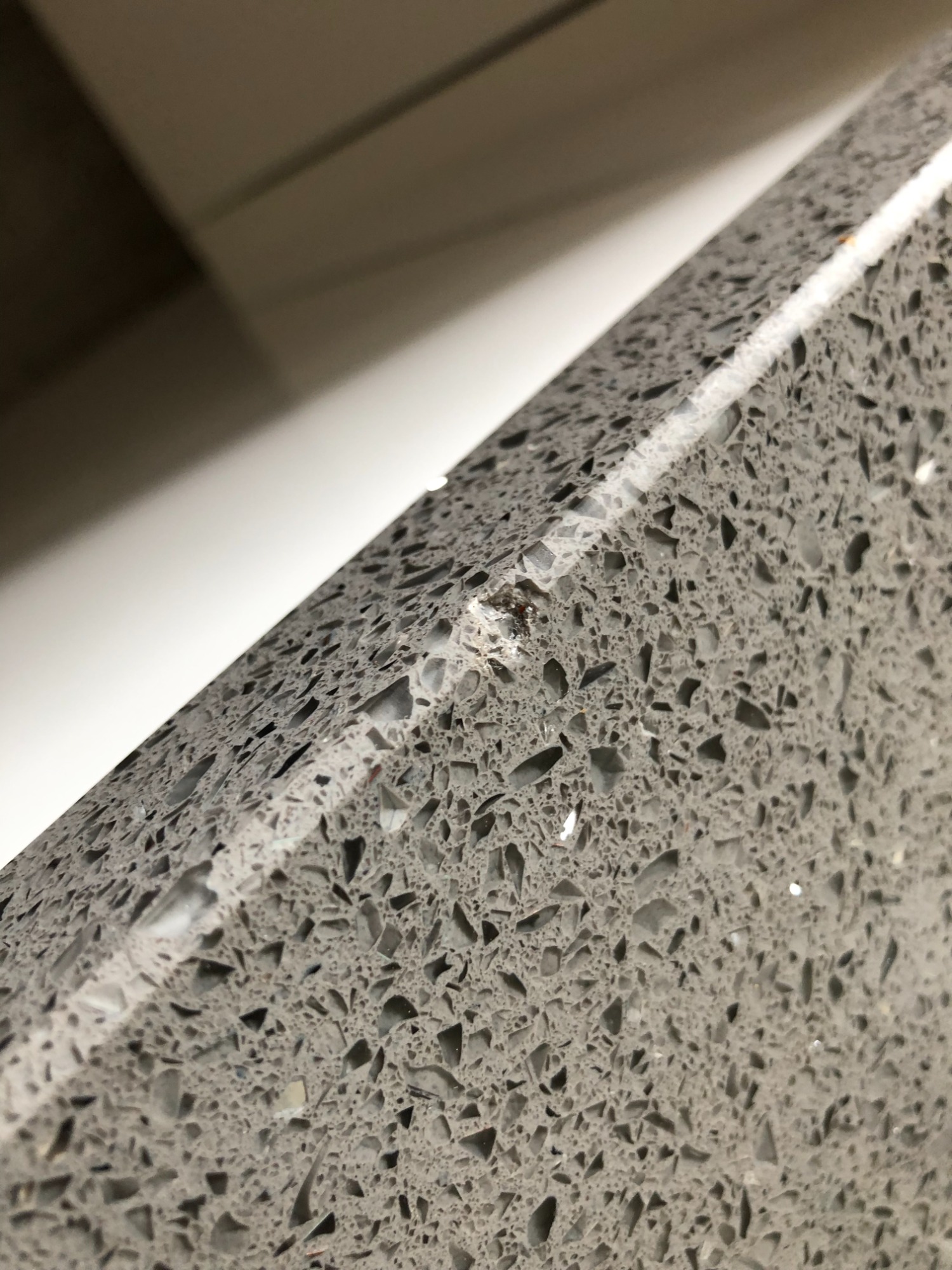 Smashed white quartz on the edge, wine bottle dropped on the worktop edge and shatterd the polished chamfer.
