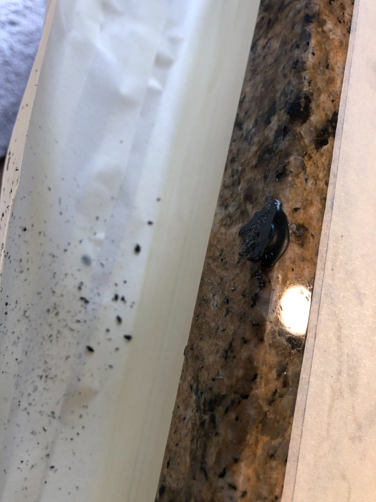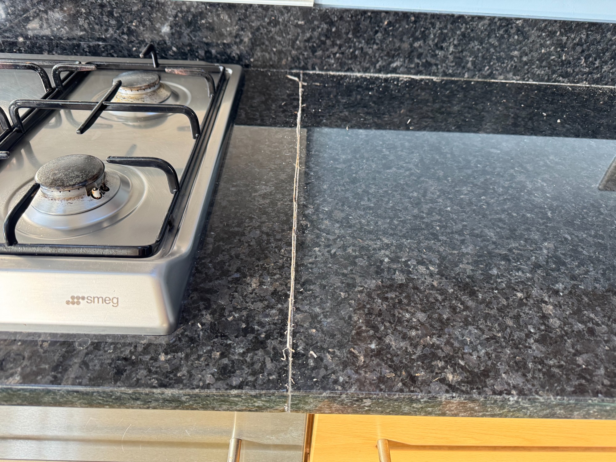 Silicone joint failed. African black granite worktop.