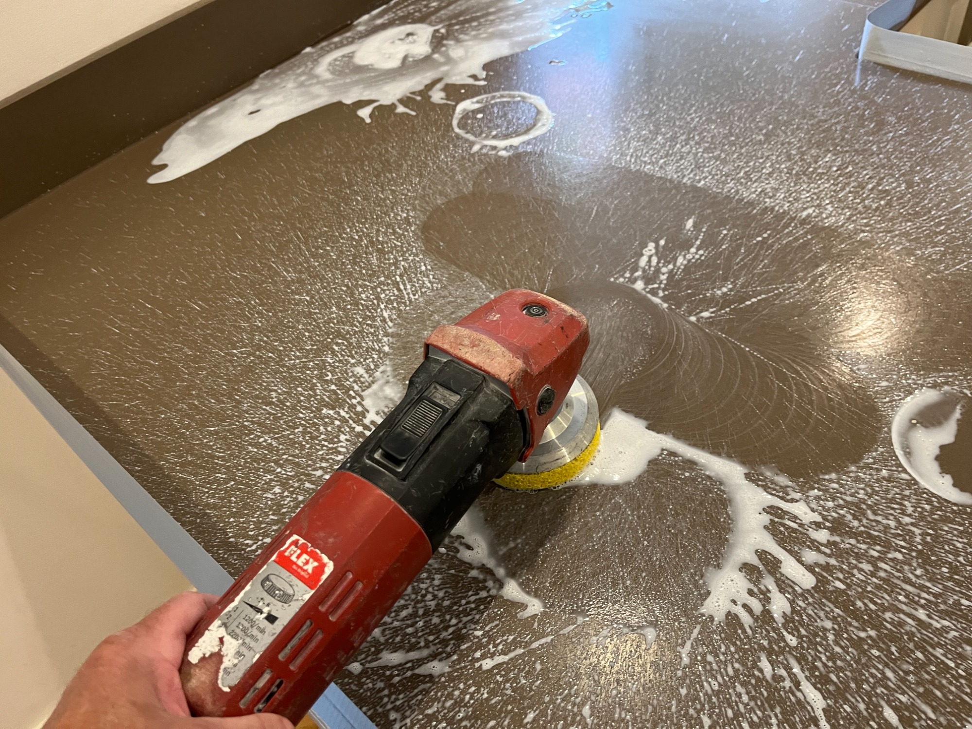 The surface on the kitchen top had to be repolished to bring back the gloss shine.