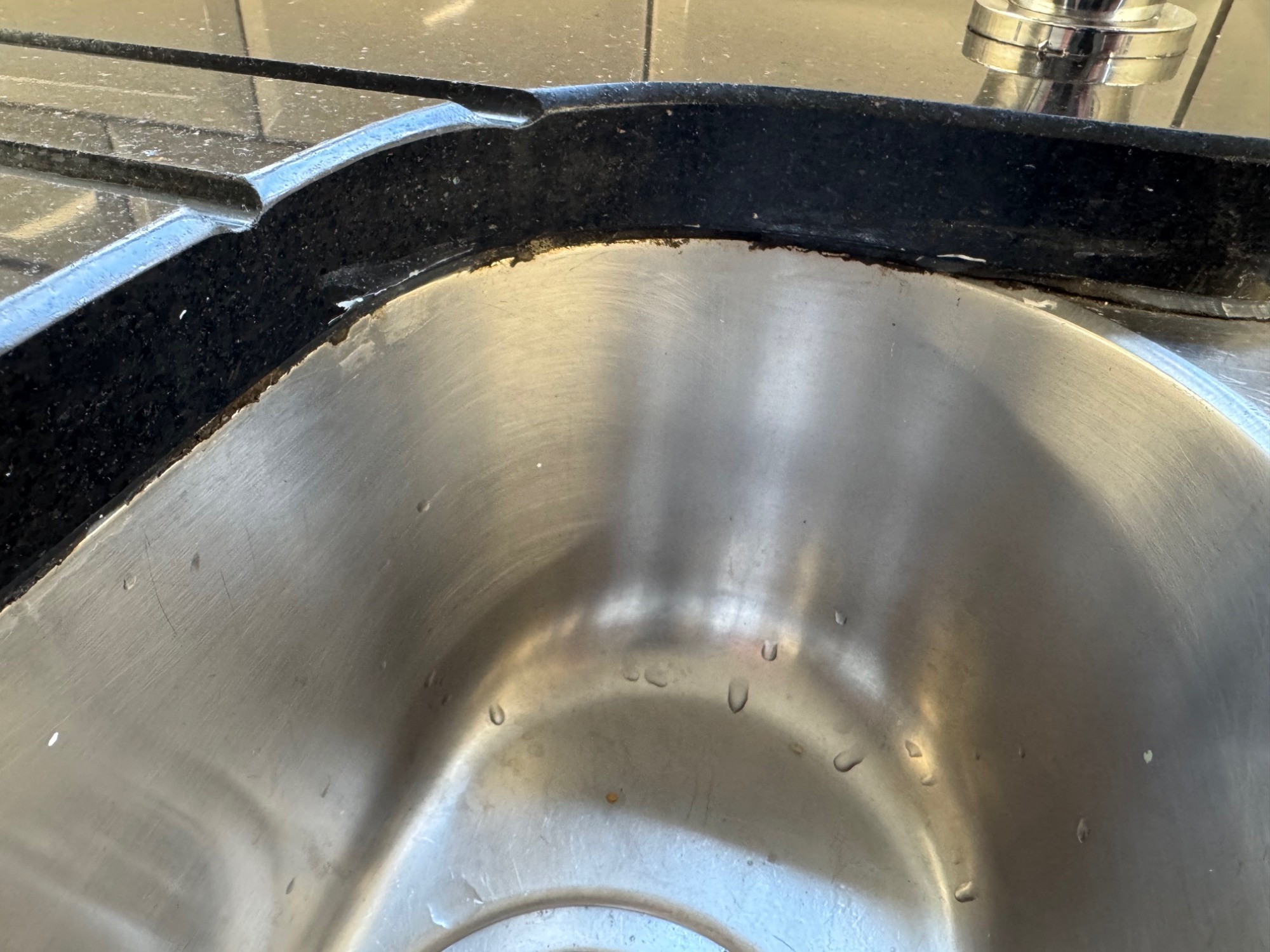 Stainless steel sink undermounted, all silicone coming out because of age, silicone doesnt last forever and needs re siliconing.