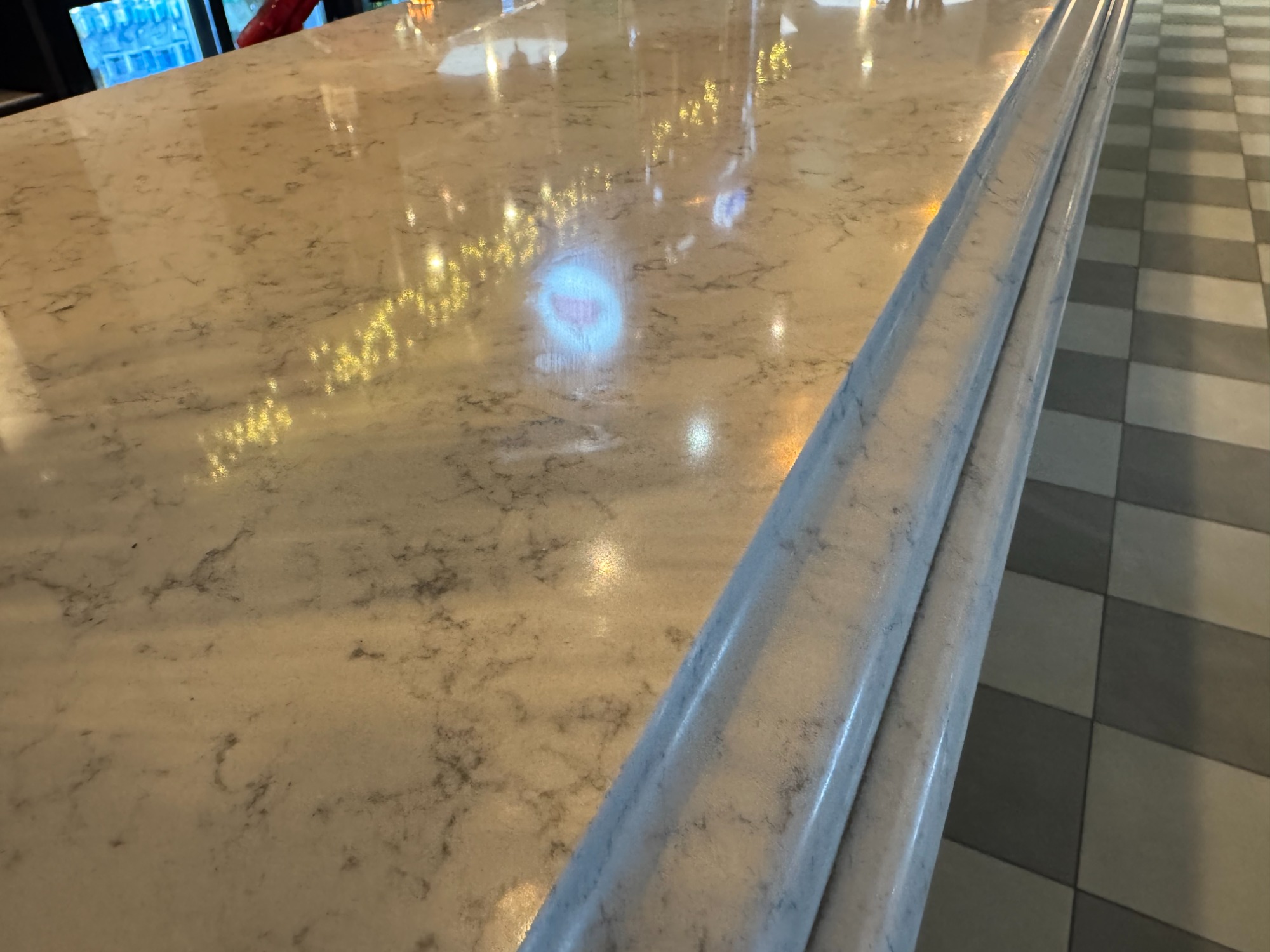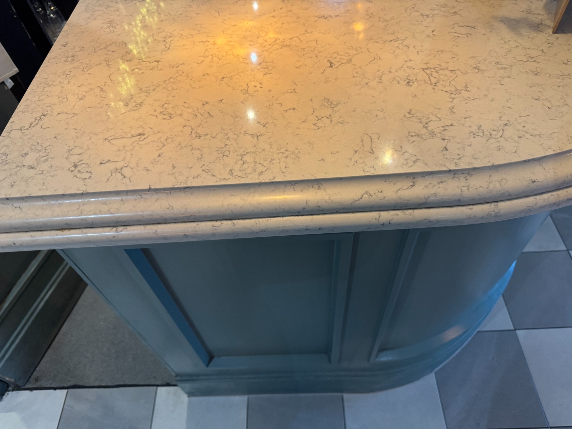 Large quartz island bar with damaged corner all polished and repaired to the highest standard possible.