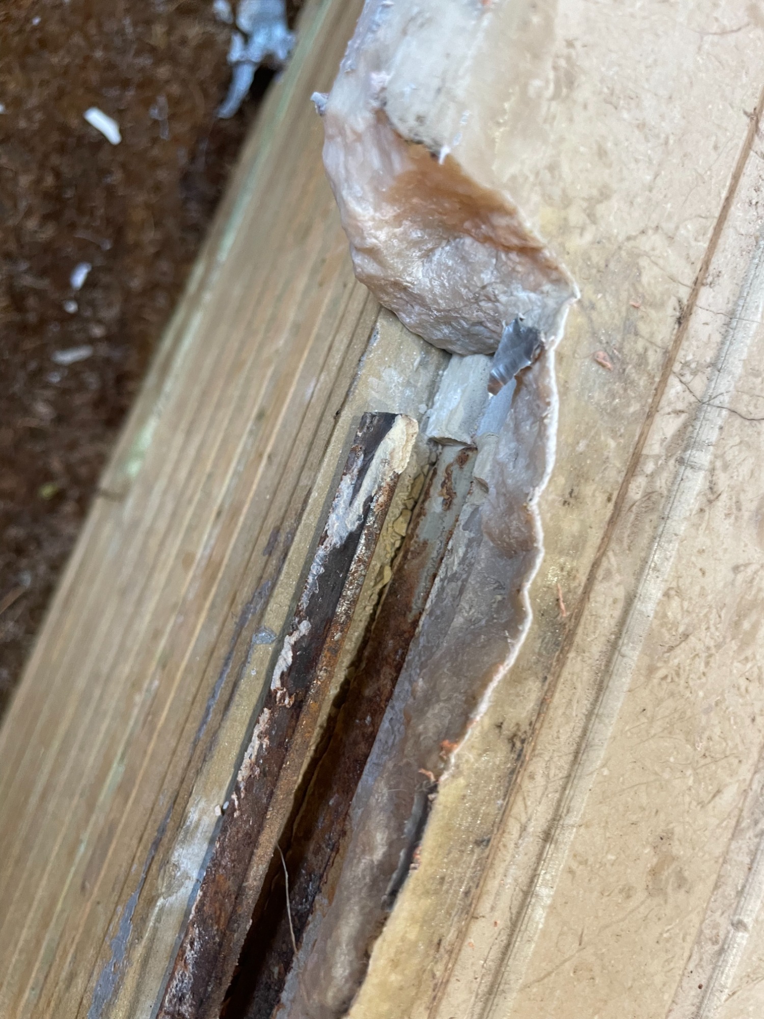 Granite worktop with a missing section. The strengthening bar at the front had rusted and split the granite.