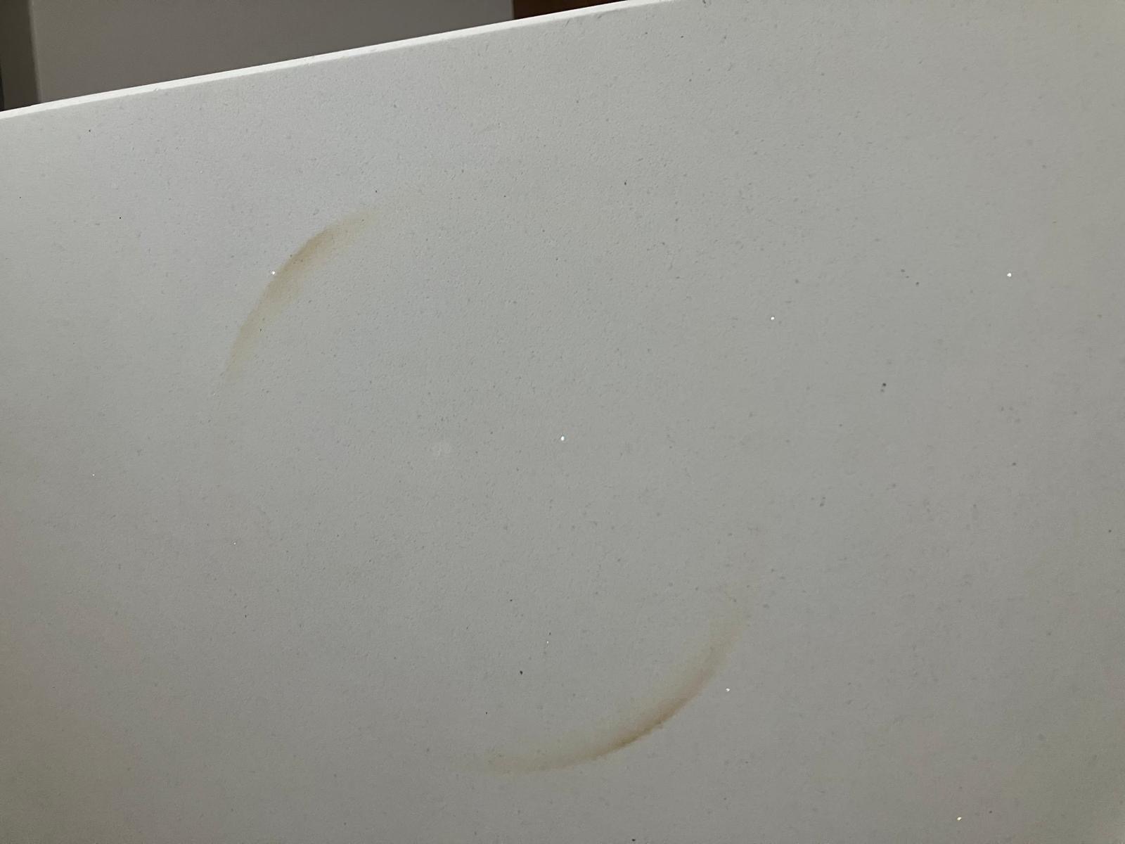 Burnt quartz top, showing ring mark from red hot pan. Circle burn mark