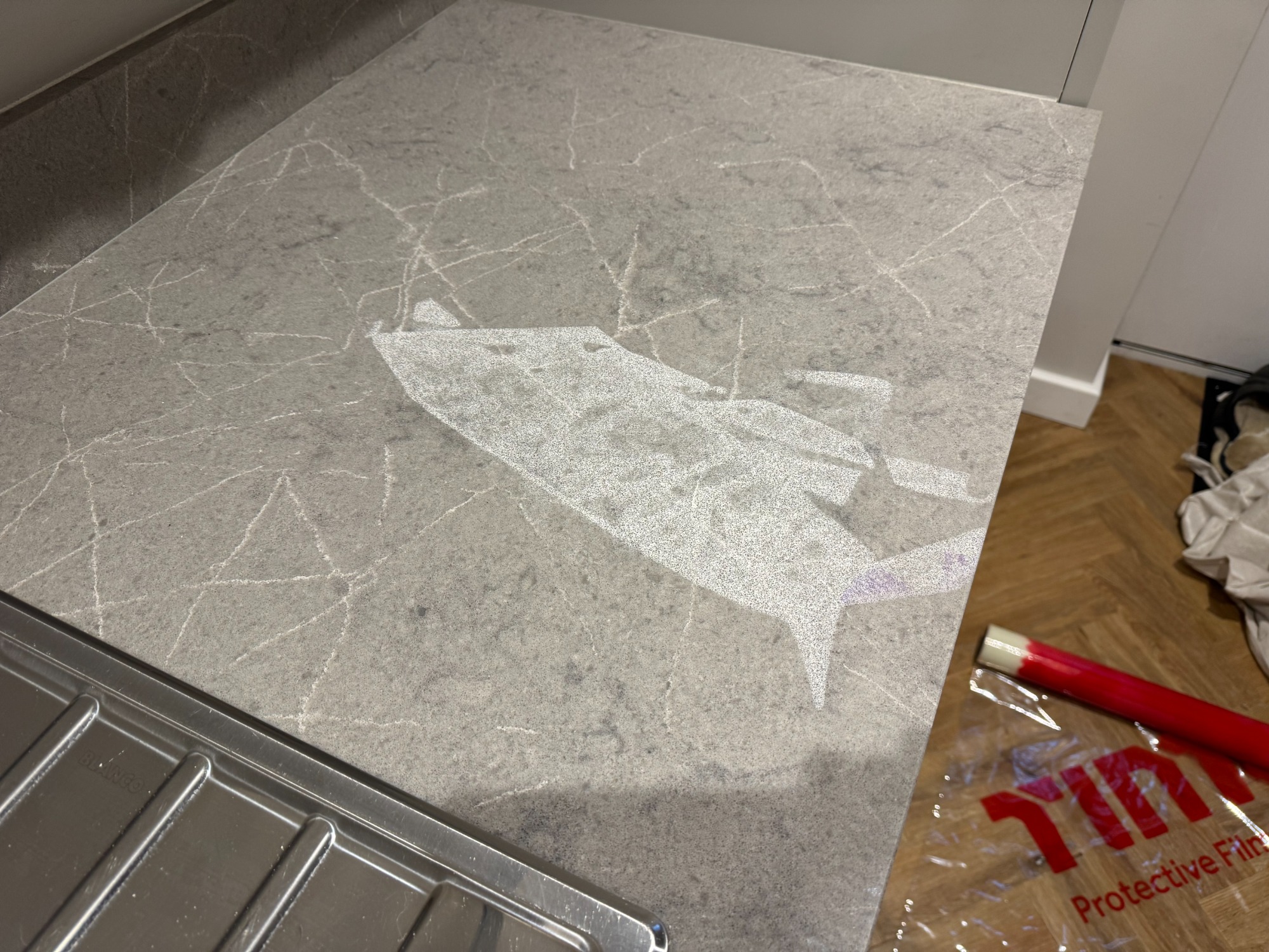 Scratched quartz kitchen worktop.
