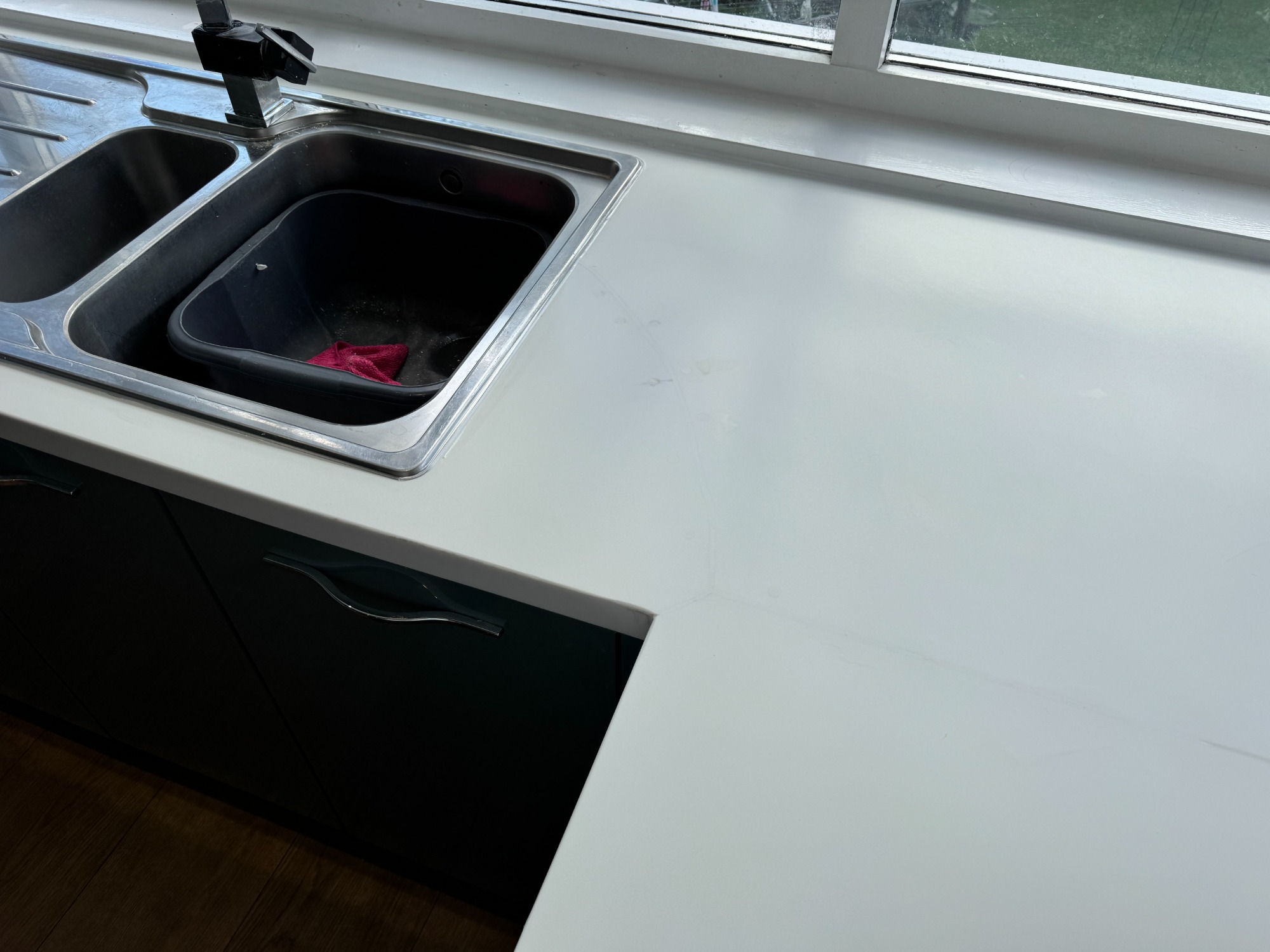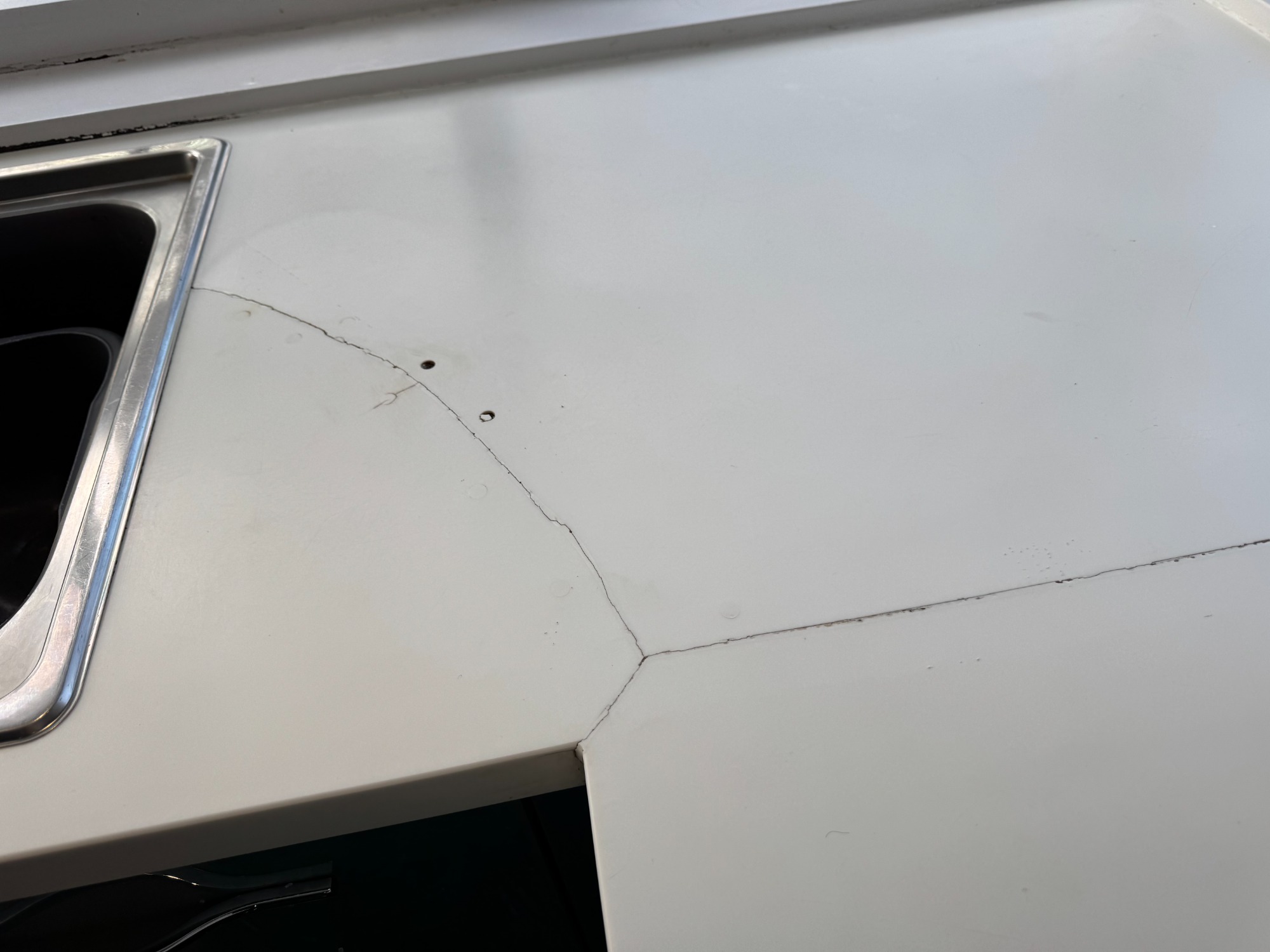 Cracked corian worktop at the sink area.