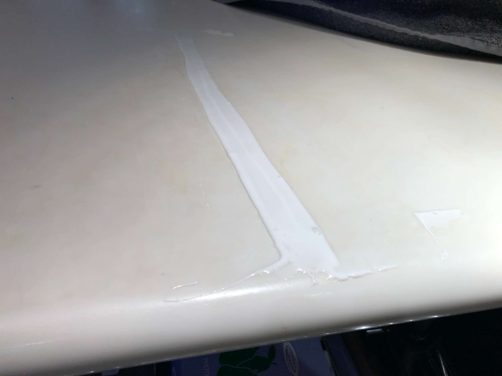 Corian bathroom top with glue in crack.